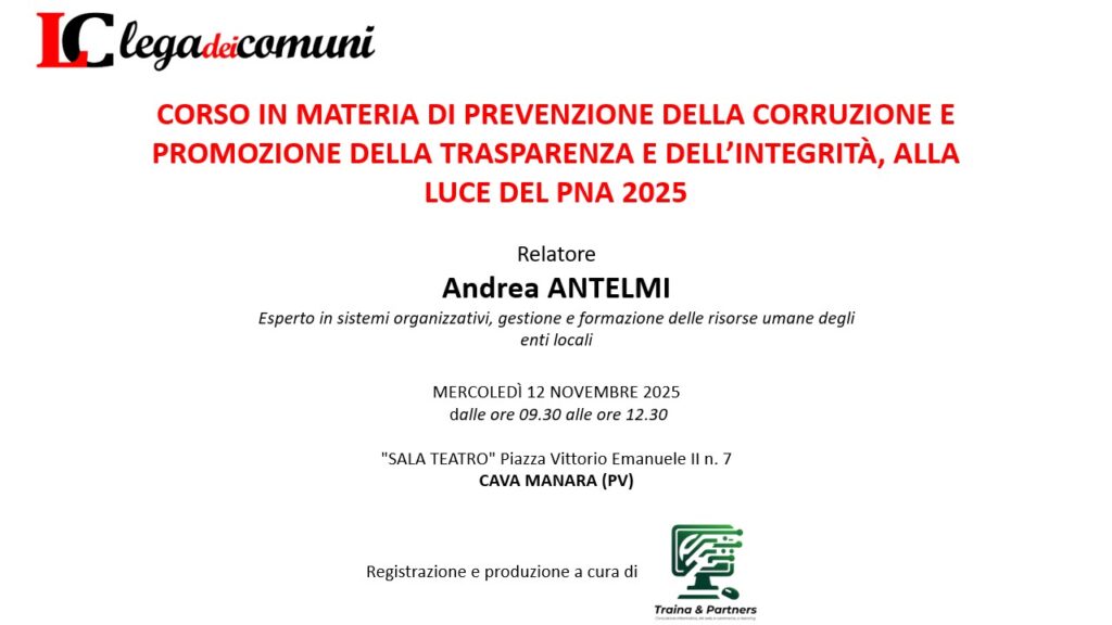 L’Associazione LEGA DEI COMUNI organizza un CORSO IN MATERIA DI PREVENZIONE DELLA CORRUZIONE E PROMOZIONE DELLA TRASPARENZA E DELL’INTEGRITÀ, ALLA LUCE DEL PNA 2025 che si terrà MERCOLEDI’ 12 NOVEMBRE 2025 dalle 9,30 alle 12,30 presso la “Sala Teatro” Piazza Vittorio Emanuele II n. 7 CAVA MANARA (PV) Relatore Andrea ANTELMI Esperto in sistemi di…