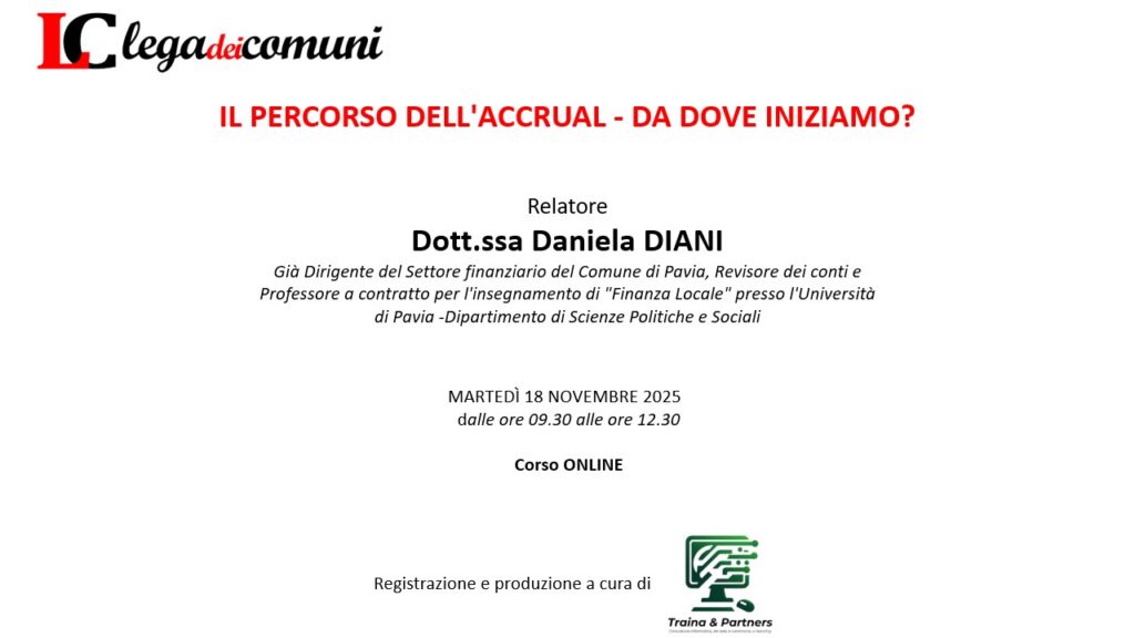 L’Associazione LEGA DEI COMUNI organizza un INCONTRO ONLINE sul tema IL PERCORSO DELL'ACCRUAL - DA DOVE INIZIAMO? che si terrà MARTEDI’ 18 NOVEMBRE 2025 dalle 9,30 alle 12,30 Relatore Dott.ssa DANIELA DIANI Già Dirigente del Settore finanziario del Comune di Pavia, Revisore dei conti e Professore a contratto per l'insegnamento di "Finanza Locale" presso l'Università…
