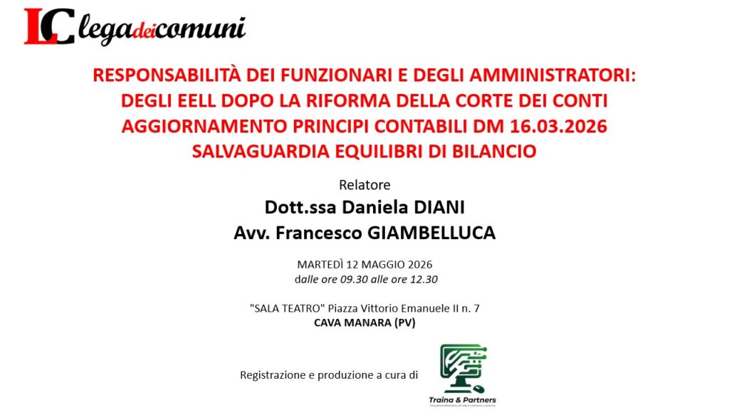L’Associazione LEGA DEI COMUNI organizza un incontro di approfondimento sui seguenti temi RESPONSABILITA’ DEI FUNZIONARI E DEGLI AMMINISTRATORI DEGLI EELL DOPO LA RIFORMA DELLA CORTE DEI CONTI AGGIORNAMENTO PRINCIPI CONTABILI DM 16.03.2026 SALVAGUARDIA EQUILIBRI DI BILANCIO che si terrà MARTEDI’ 12 MAGGIO 2026 dalle ore 9,00 alle ore 13,00 presso la “Sala Teatro” Piazza Vittorio…