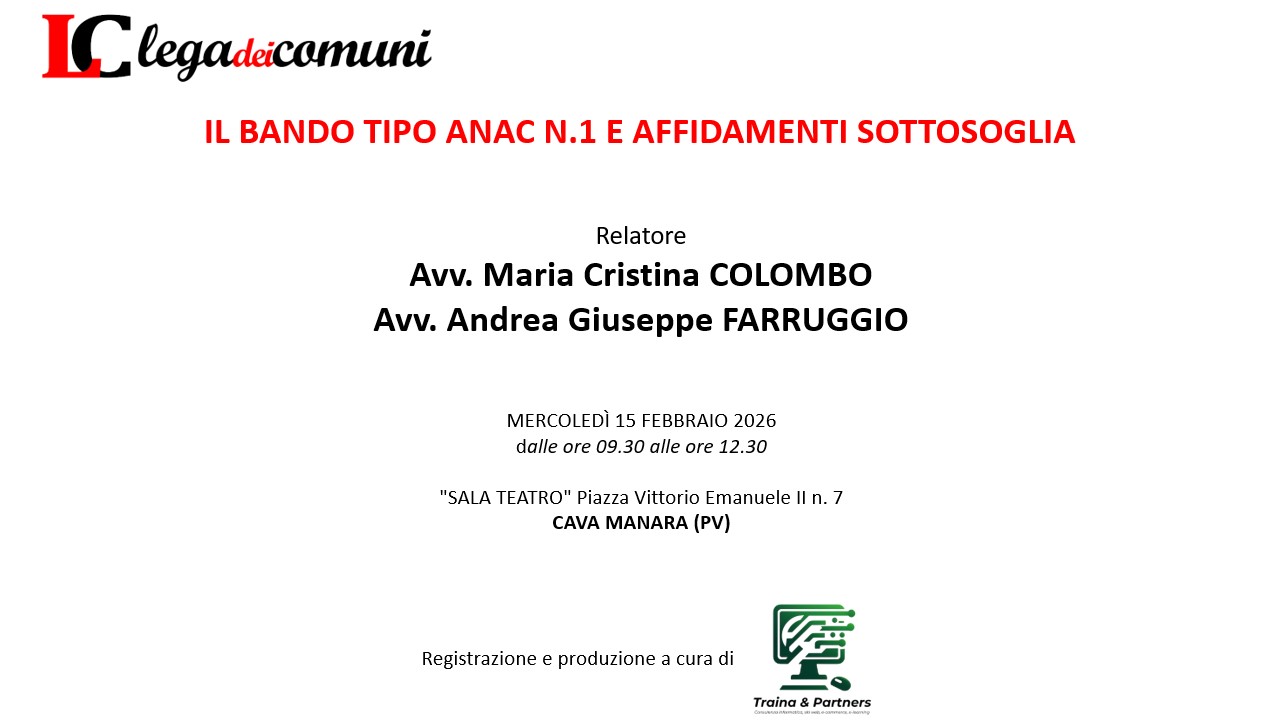 Con l’obiettivo di analizzare la struttura e le finalità del nuovo Bando tipo ANAC, e fornire indicazioni operative per le stazioni appaltanti sulle procedure di affidamento sotto soglia, distinguendo tra affidamento diretto, procedura negoziata e confronto concorrenziale, l’Associazione LEGA DEI COMUNI organizza un incontro sul tema